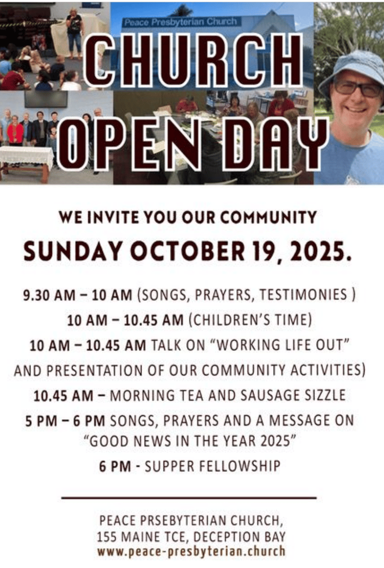 BIBLE FELLOWSHIP GROUPS: 9.30 am Tues Deception Bay - 9.30 am Wed Burpengary - 7.15 pm Wednesday Zoom - 9.30 am Friday Prayer Meeting for more information please contact the Minister.